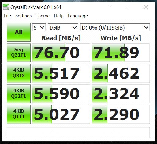 Stigla mi je Samsung Evo + memorijska od 128Gb U3, 14 dana China postom. Ima samo 65MB/s čitanje i pisanje u H2testw dok u crystaldisku ima 82 MB/s čitanje a 75MB/s pisanje. ![]() ![]() Testirao sam u laptopu koji ima ugrađen SD čitač (+ koristim adapter). Kako je netko imao 90MB/s pisanje, je li moja nešto lošija? (na laptopu mi je problem raditi ss, već sam slikao mobitelom)