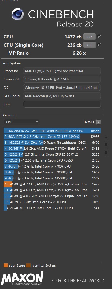 Ne zamaraj se puno s tim benchom, FX ima 8 threadova i zbog toga gazi ovog i5 koji ima samo 4. Cinebench voli dodatne threadove. Oba procesora su pregažena vremenom.