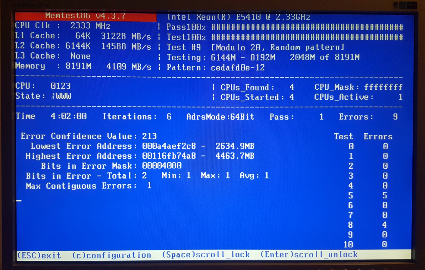 Ubo sam 4x2gb DDR2 800mhz za staru P35C-DS3R. Ploča ima Xeon mod i 5410 proc Sve postavke su na defaultu i na auto regulaciji Prvo sam testirao kad sam ubo sva 4 modula i dobio sam erore na slici u prilogu Onda sam testirao sva 4 modula pojedinačno na DIMM1 slotu, svi su prošli bez errora Potom sam ispremješao module i opet ih ubo sva 4 i skupa testirao i dobio sam samo jedan error, ovaj prvi "000a4aef2c8 - 2634,9MB" ideja kako da to riješim? |