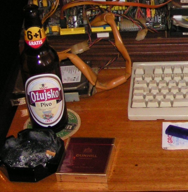 Poanta je u 6+1 A tko kaže da nema pljuga??? Ah, nema veće sreće za starog Žderonju-poslije obilnog ručka sjedneš za komp, upiknuta tranu X1800XT, hladna Žuja (jedna đaba ) i pljuga.....mrmlj...Istinabog-komponente sam počupao i stavio na stol jer me je Expertica nekaj zezala a meni se nije dalo malo-malo mjenjat ploče u kućištu. Slikanje mi ni nije palo na pamet dok Masni nije izvadio mob i počeo slikat... |