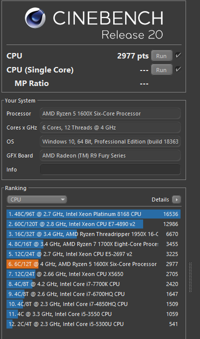 Meni danas stigo r5 3600x i Sapphire RX 5700 XT Nitro+ SE. Poštimo sve prema Discovim uputama i CPU boosta na 4425 Mhz. Evo i rezultata Time spy 1. 1600x + R9 Fury: https://www.3dmark.com/3dm/43080099 2. 1600x + RX 5700 XT: https://www.3dmark.com/3dm/43081097 3. 3600x + RX 5700 XT: https://www.3dmark.com/3dm/43084700 PUBG sam imao oko nekih 60-80 fps-a s prvim primjerom, sa drugim 100-120, a sa trećim od 120-160. Kada sam ubacio rx 5700 xt sa 1600x iskoristivost gpu-a je bila između 60 i 80% dok je sa 3600x 90-100%. Ovo je osjetni upgrade u odnosu na stari cpu i gpu. Budem se jos malo igro s postavkama u BIOS-u, a i probat ću Brkine postavke jer možda bude bolje boosto nego sa trenutnim ako me posralo ![]() EDIT: Cinebench R20 http://forum.pcekspert.com/attachmen...1&d=1579297318 http://forum.pcekspert.com/attachmen...1&d=1579297255 Zadnje izmijenjeno od: Litra. 17.01.2020. u 23:42. |