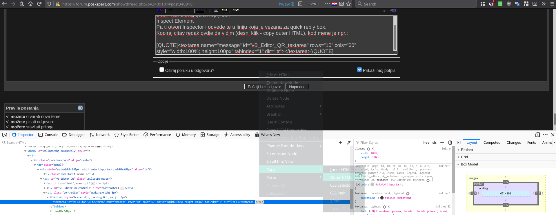 Mozes li napraviti sljedece u Mozilli: Desni klik u ovaj quick reply box Inspect Element Pa ti otvori Inspector i odvede te u liniju koja je vezana za quick reply box. Kopiraj citav redak ovdje da vidim (desni klik - copy outer HTML), kod mene je npr.: Code: