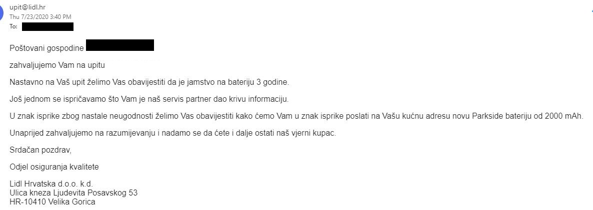 U vezi jamstva na 20V baterije iz Lidla. Nakon što nisam više mogao napuniti bateriju, nazvao sam servisu i rekli su da je jamstvo na bateriju 6 mjeseci. U uvjetima jamstva za aku bušilicu se to nigdje nije spominjalo pa sam poslao upit Lidlu i rekli su da je i na bateriju jamstvo 3 godine i da je serviser dao krivu informaciju pa su mi poslali novu. Prije 2-3 tjedna kad su takve baterije bile na prodaju, pored njih je pisalo da je jamstvo 3 godine. Ako imate isti problem da servis nije htio zamijeniti baterije jer su starije od 6 mjeseci, možete poslati upit Lidlu pa će vam vjerojatno poslati novu bateriju. |