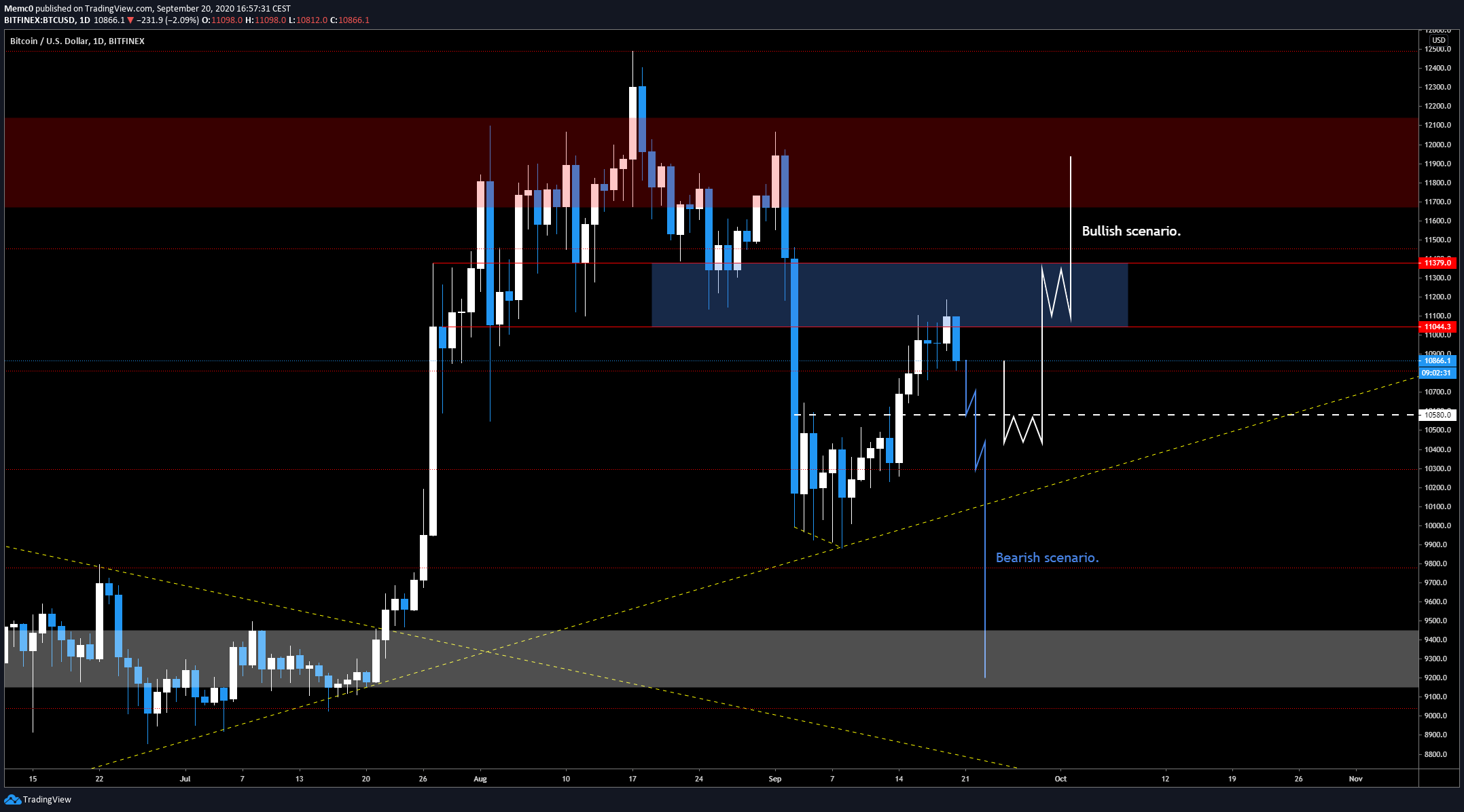 Nadam se da će na sljedećem retestu, ako ga bude, proletit kroz 10600 i tu razinu potvrdit kao support. Trenutna struktura na 1H TF i RSI ukazuju na to da bi moglo ponovo na tu razinu. Samo nam treba da ode preko i izgledi će biti bolji za bikove. ![]() Edit: Lets go! ![]() Nakon ovog ne smijemo ispod 10400, jer inače bye-bye 12k, hello 9k. Čini mi se da uskoro uklanjam bearish scenario sa charta. Cirka 2-3 dana... Zadnje izmijenjeno od: PR3DA70R. 24.09.2020. u 20:34. |