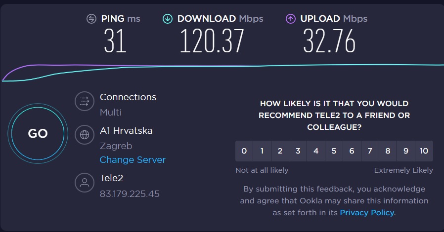 Ja danas prešao na A1, tj imam još i Tele2 par dana. Čisto usporedbe brzine, isti ruter. Ko što rekoh, ja bio prezadovoljan sa Tele2 i brzinama, al džaba kad usraše sve....