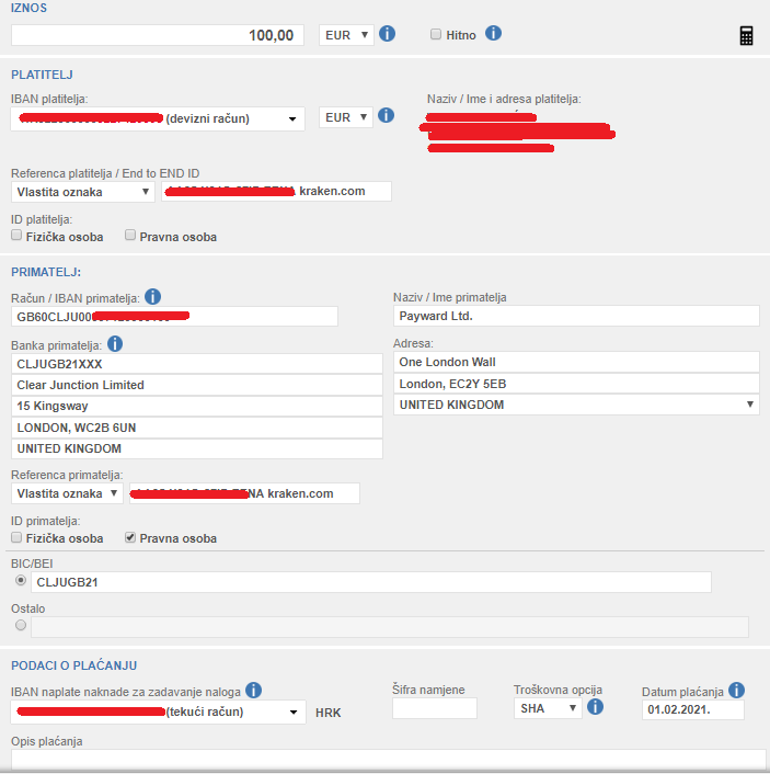 Bok Ekipa. Radim prvu uplatu na Kraken. Može netko pametniji mi pomoći, muči me šifra namjene - da li se ona stavlja? Te troškovna opcija jel ide SHA ili OUR? Pod SHA mi Zaba uzima 30 kn - jel to ok, tj. hoće mi na Kraken sjesti svih 100 Eura ili manje? Jel ovo ostalo OK popunjeno? Hvala unaprijed.