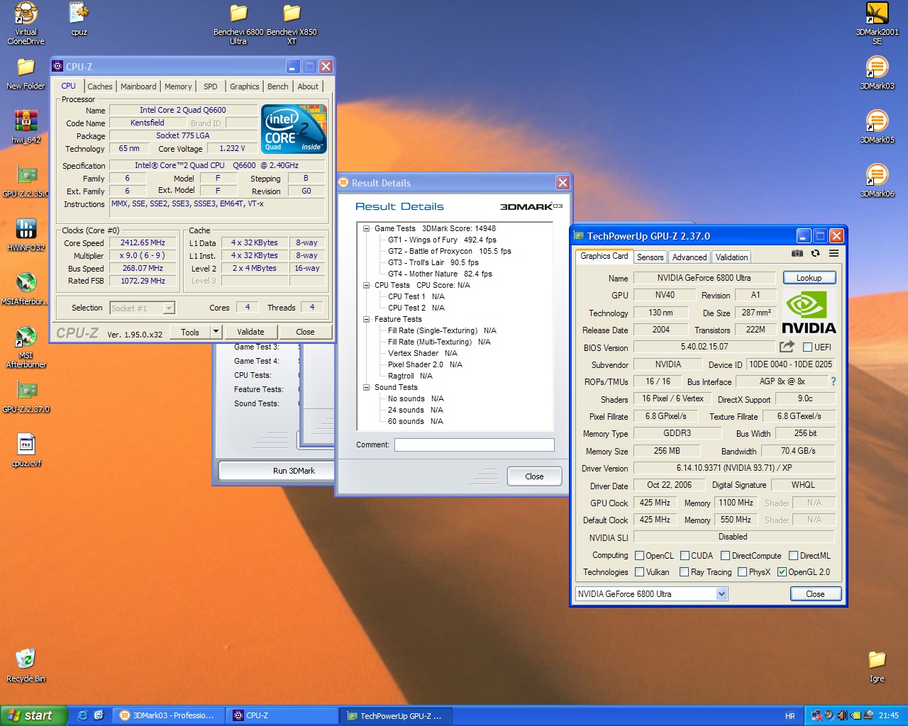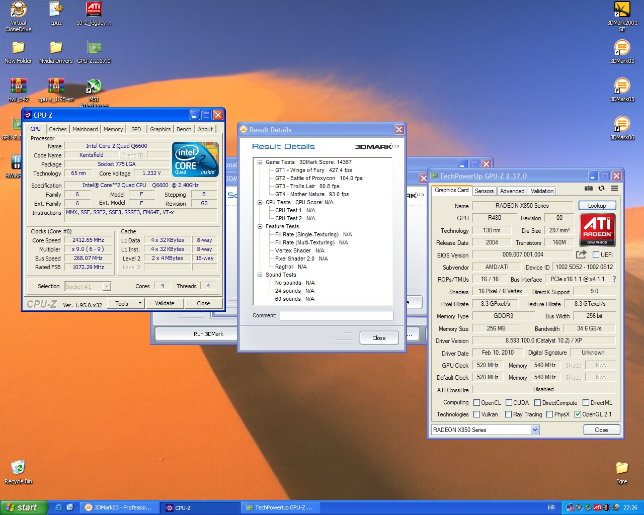 Nedavno nabavio ASRock 4CoreDual-Sata2 maticnu plocu i odlucio da sastavim ultimativni AGP sistem za igranje i testiranje AGP kartica Sistem se sastoji od: Intel Core 2 Quad Q6600 (trazim trenutno QX6700 & QX6800) ASRock 4CoreDual-Sata2 2Gb 533Mhz DDR2 Crucial BX500 480Gb SSD Kolink Enclave 500W Gold MPS Creative X-FI Xtreme Gamer Silentium Pc Ventum VT4V EVO TG ARGB White Kako maticna ima AGP i PCI-EX (x4) napravio sam test flagship-ova iz 2004, Geforce 6800 Ultra 256 Mb AGP vs Radeon X850 XT 256 Mb PCI-Ex Testovi su: 3DMark2003 default 3DMark2005 default D00M3 1280x1024 ULTRA F.E.A.R. 1024x768 Maximum ----------------------------------------- Geforce 6800 Ultra AGP 3DMARK2003 3DMARK2005 D00M3 F.E.A.R. ---------------------------------------- Radeon X850 XT PCI-Ex 3DMARK2003 3DMARK2005 D00M3 F.E.A.R.