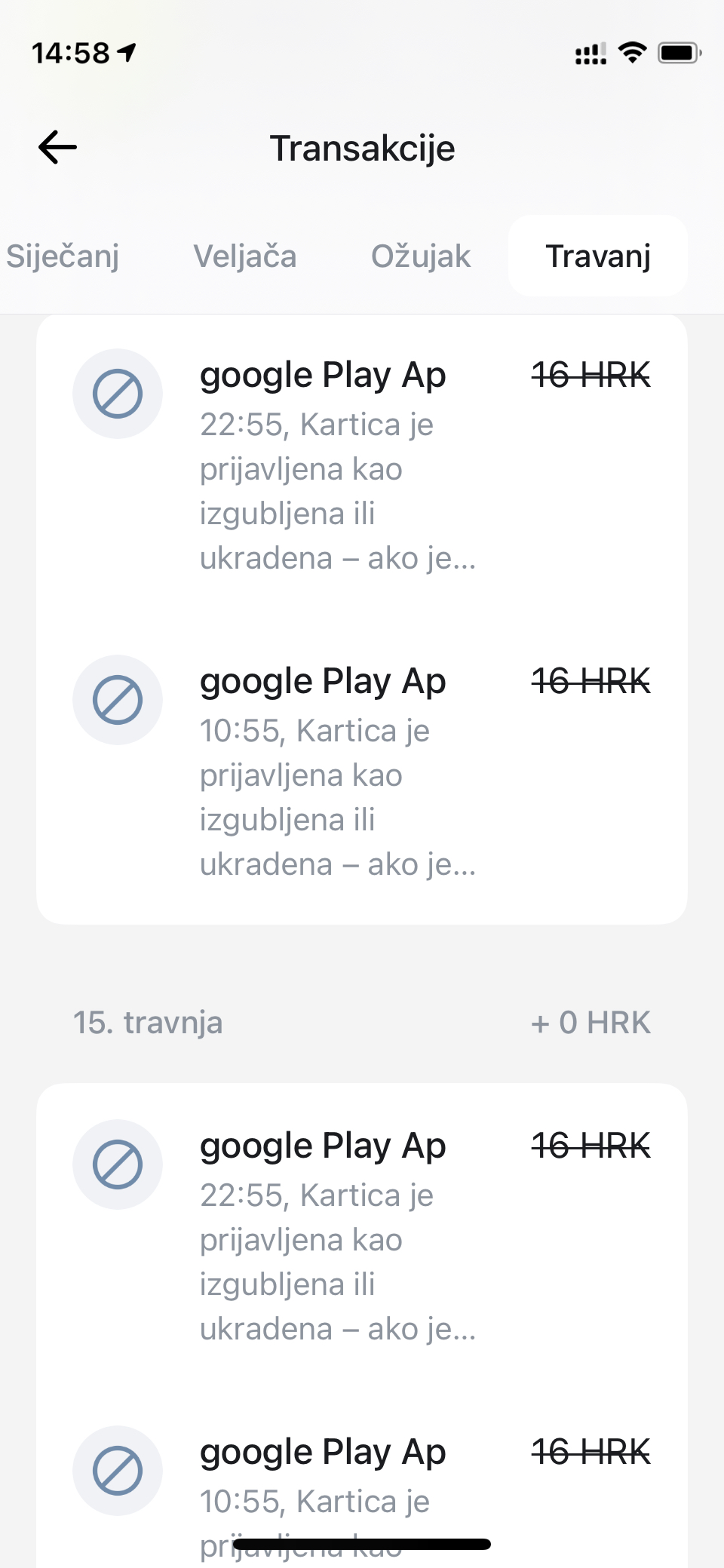 Ljetos sam izgubio jednu od Revolut kartica, odmah sam ju blokirao. Kartica je pronađena i vraćena mi je, međutim uskoro sam počeo dobivati obavijesti o blokiranoj transakciji prema Google Play. Desilo se u nekoliko navrata i onda mir do prije cca 2 tjedna. Sad mi se pojavljuje svakodnevno i to u 10:55 i 22:55 i spamma mi izlistanje. Izgubio sam se u Revolut "korisničkoj podršci", a mogu se snaći čak i u izborniku HT govornog automata. |
