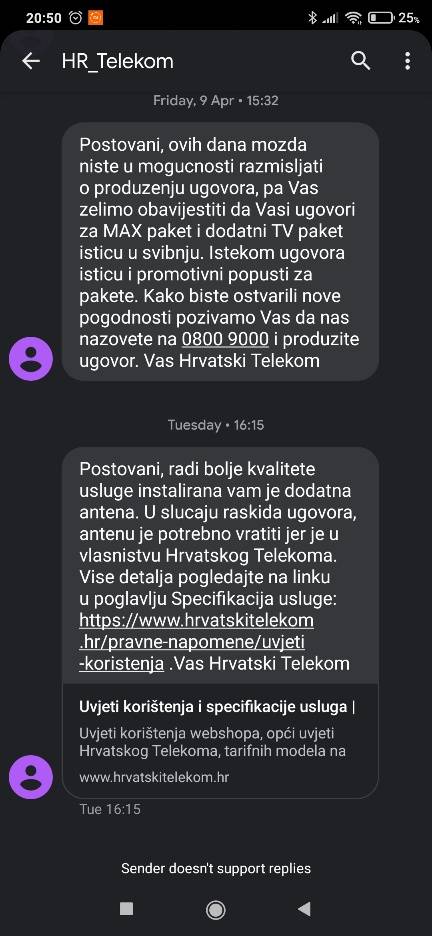 Zanimljiva stvar ovaj mjesec. Ja sam u 6/2019 prešao s HT-a na Bnet tj A1. Više nisam njihov korisnik. I ovaj mjesec, su me na mobitel (koji nije dio HT-a) ali je bio vezan, točno 2 godine i mjesec dana prije isteka ugovora zvali iz HT-a i počeli priču kako sam bio njihov korisnik i želim li opet prijeći, nudili za 209kn Max3 na VDSL-u. Zahvalio sam se, rekao da sam već produžio koji tjedan ranije i da sam produžio za 199kn i imam puno veću brzinu od 50mbps. Interesantno kako HT radi bazu korisnika, zadržava podatke i kontakt brojeve iako više nisi njihov korisnik i onda 2 godine kasnije zove korisnika za prijelaz, znajući da im ističe ugovor.