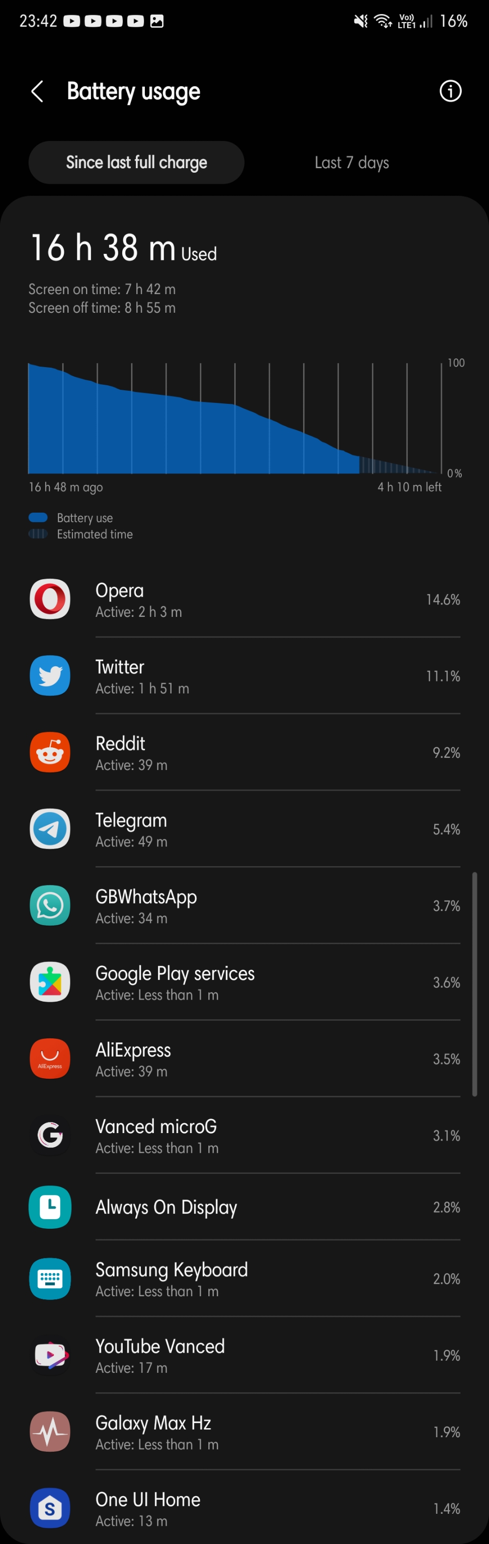 Ispod je stanje baterije od jučer rano ujutro (oko 5:30) kad sam skinuo mob s punjača do kasnije navečer. Sve je vidljivo u ss-u, većina SoT-a su browser i društvene mreže što je dosta teže za samu bateriju nego upalit youtube na par sati i tako "napumpati" SoT... Skoro 9h od ukupnog vremena sam proveo na 4g signalu, ostalo doma na WiFi-u. Btw, nikad ne volim prazniti bateriju ispod 15% ali da sam išao namjerno do cca 5% dobio bi sigurnih 8 i po sati SoT od ukupno 17-18h na bateriji, što je jako dobar rezultat za jedan flagship mobitel IMO ![]() Edit: Postavke koje koristim ako koga zanima... ● FHD sa adaptivnim RR-om ● Adaptivno osvijetljenje ● AOD upaljen cca 18h dnevno ● Lokacija stalno upaljena ● NFC i BT upaljeni samo kad sam van kuće (Bixby Routines) ● 5G ne koristim Zadnje izmijenjeno od: Sn4k3. 22.04.2022. u 17:12. |