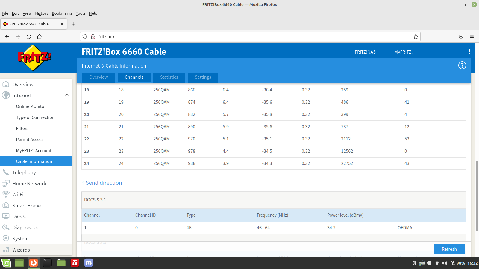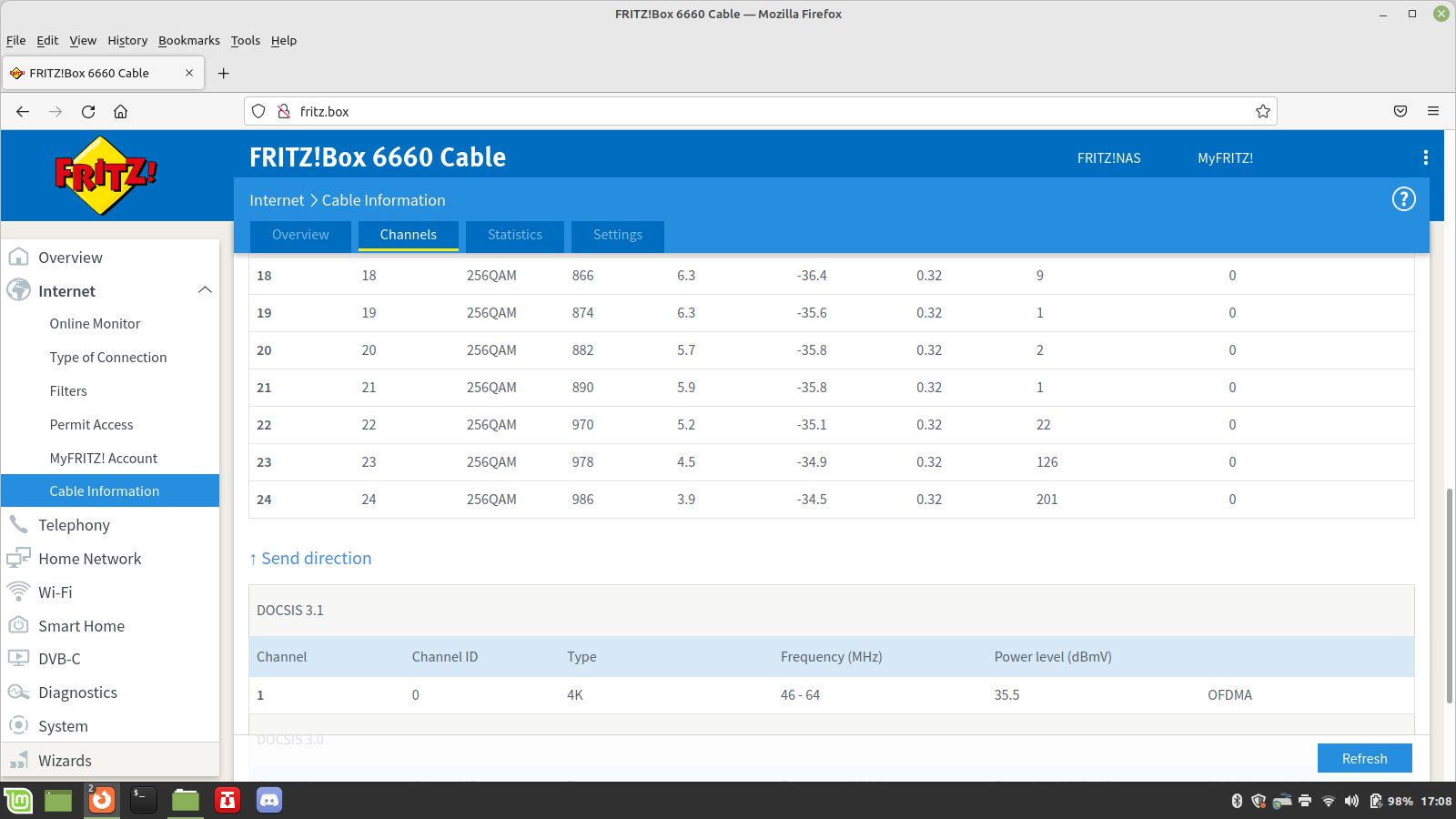 @d0x: prije misec dana sam dogovara produzenje i dogovoria sam 90kn popusta (mislim da je bez mozaik povezivanja max 100kn popusta): za 1gb net + osnovni + sportski + cam + flat fon = 264kn... kad se odbije sportski + cam (45kn) bi bilo 219kn... al evo u mene nije bas najsritnije stanje sa 1gb netom... prvih cca 2tjedna je sve bilo stabilno i onda od 7.4. popodne krecu problemi sa stabilnoscu veze, fritz je pocea gubit sinkronizaciju svako par sati, kvar prijavljen i prvi tehnicar je ustanovia da je problem najvjerojatnije u modularnoj uticnici (vimar, iec konektor) i da bi tribalo prominit jer je zadnji set frekvencija slabijeg signala... promijenio je f-konektor na ulaznom kabelu u stan i direktnom konekcijom s tog kabela na ruter (zaobilazeci glavni "splitter" a zapravo oduzimac jos iz doba dcm-a/bneta te splitter kod rutera/tv-a) mu je pokazivalo za sve frekvencije stabilan signal... kako je za promjenu uticnice bilo potribno izmaknit regal, isa je novi termin... novi tehnicar je obavia zamjenu uticnice, a zatim i kabel od uticnice do 1-u-2 splittera te na kraju i oduzimac za 1-u-3 splitter i izmjena f-konektora na izlazu iz 1-u-3 splittera te tweakanje u njihovu ormaru i nije bilo osjetnijeg pomaka u kvaliteti signala za vece frekvencije... tehnicari su mi rekli da su u noci 7. na 8.4. radili na glavnoj centrali za split i da su smetnje priko noci zbog tih radova a meni se cini ko da su smetnje koje su krenile 7.4. popodne takodjer povezane s time... problem je i dalje prisutan, sa svoje strane sam podiga 1-u-2 splitter i kabele da nisu iza regala uz prikljucak od struje i od tada je malo stabilnija situacija al i dalje dolazi do pucanja veze... planiram također privremeno zaobic 1-u-2 splitter da vidim oce li to ista pomoc... evo ispod attachirane slike za stanje kanala od zadnje konekcije (izdrzala taman nekih 15h) i stanje nakon cca 10min)... najcudnije od svega mi je sta je stvar bila totalno stabilna prvih 13 dana, ip renewal je isa tocno svako 86h 24min (također su bile pristune greske po kanalima, al nazalost iz tog perioda nemam screenshot stanja jer je sve radilo ).... i sta se tice brzine ona je unutar gabarita, tehnicarima preko wifi6 isto daje punu brzinu...svaki komentar, prijedlog, misljenje dobro doslo xD... Zadnje izmijenjeno od: OF&H. 21.04.2022. u 18:34. |