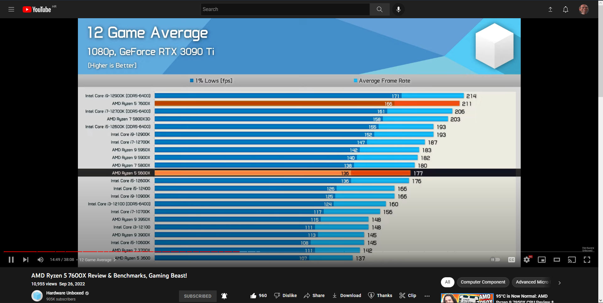 Ispada jako dobar proc ovaj 7600x. Ali opet mislim da je bolja kombinacija 5600x i recimo 3080, nego 7600x i 3060ti sta dode isto cijenom. Ako se vec ima jaka grafa onda radije uzet 7600. Mislim da ce obicni 7600 biti opet super kupovina jednoga dana kada ga izbace, i do onda ce ddr 5 i maticne past u cijeni. Sent from my VOG-L29 using Tapatalk |
