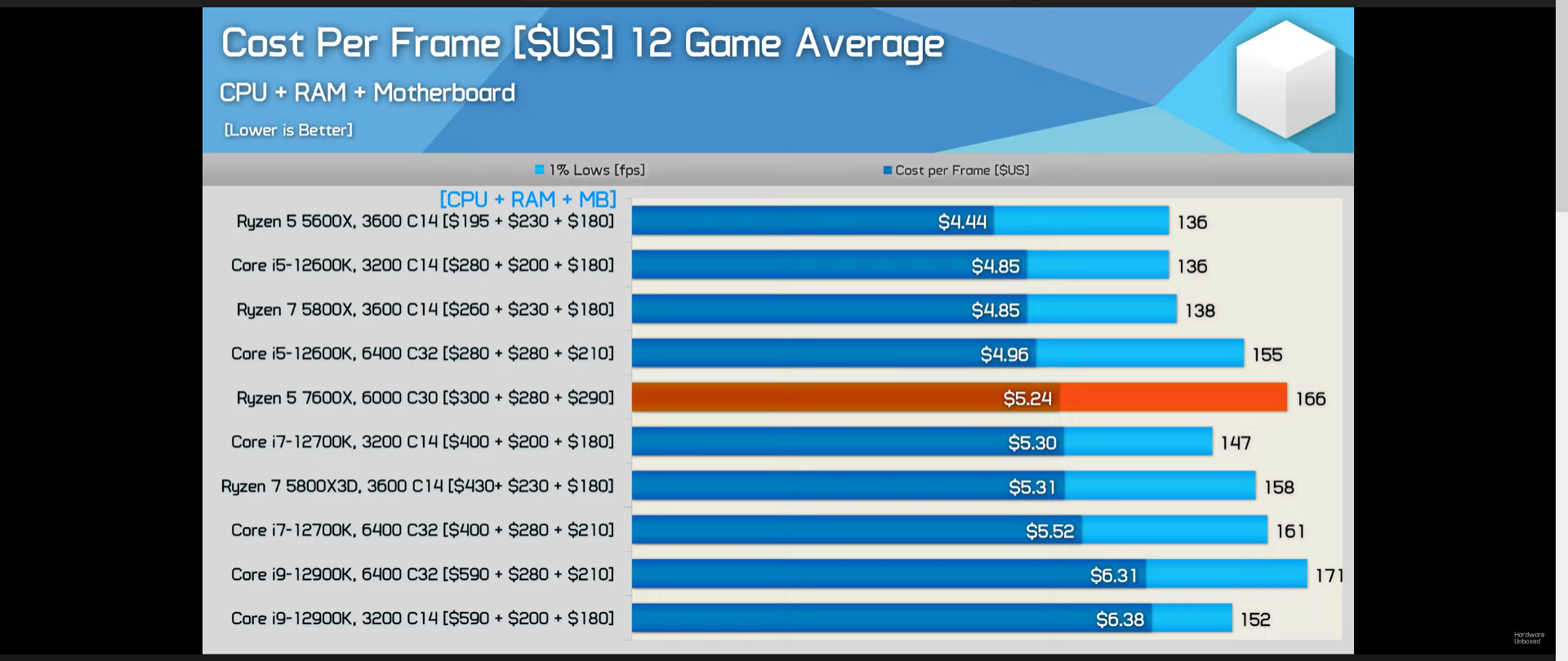 Ima na HU videu na 30:00 cost per frame analiza, uključuje mbo i ram. Da, 12600k je bolji, 5800x3D je mrvicu bolji, ali 5600x je najbolji ako je to metrika... Ja se slažem da je riječ o premalenom pomaku u odnosu na Zen 3 ako se radi o cistoj nadogradnji, bacanje novaca. Mbo i ddr5 cijene se moraju malo smiriti još. Ali da su performanse tu, jesu. Dobar release. |