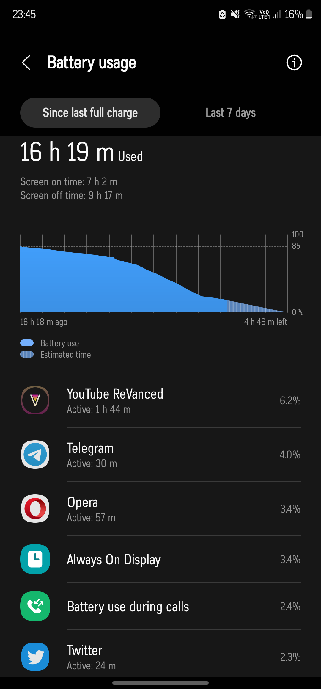 Evo nakon full reseta i clean installa svih appova, baterija mi se čini puno bolja sada + onaj screen timeout se više ne vraća na 1min. Postavke sada: fhd+, adaptive rr, light procesor, adaptive battery na off, put unused apps to sleep na off, manualno dodao appove u sleep i deep sleep liste, ram plus off, protect battery off, wifi power saving on. Prema Accubatteryju, troši prosječno 2%/h. Jutros od 8 do sada potrošio 10%. Sent from my SM-S918B using Tapatalk |