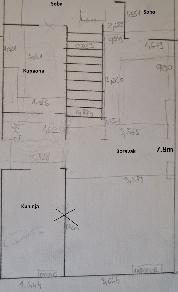 Pa isti kao inaš tu u Dugavama, jedino kaj se mi spuštamo dolje po štengama. Isto maknuli zid od kuhinje, tak da je dnevna povezana s kuhinjom, a otraga je jedna velika spavaća soba. Isto špajz i kupaona pored stepenica.