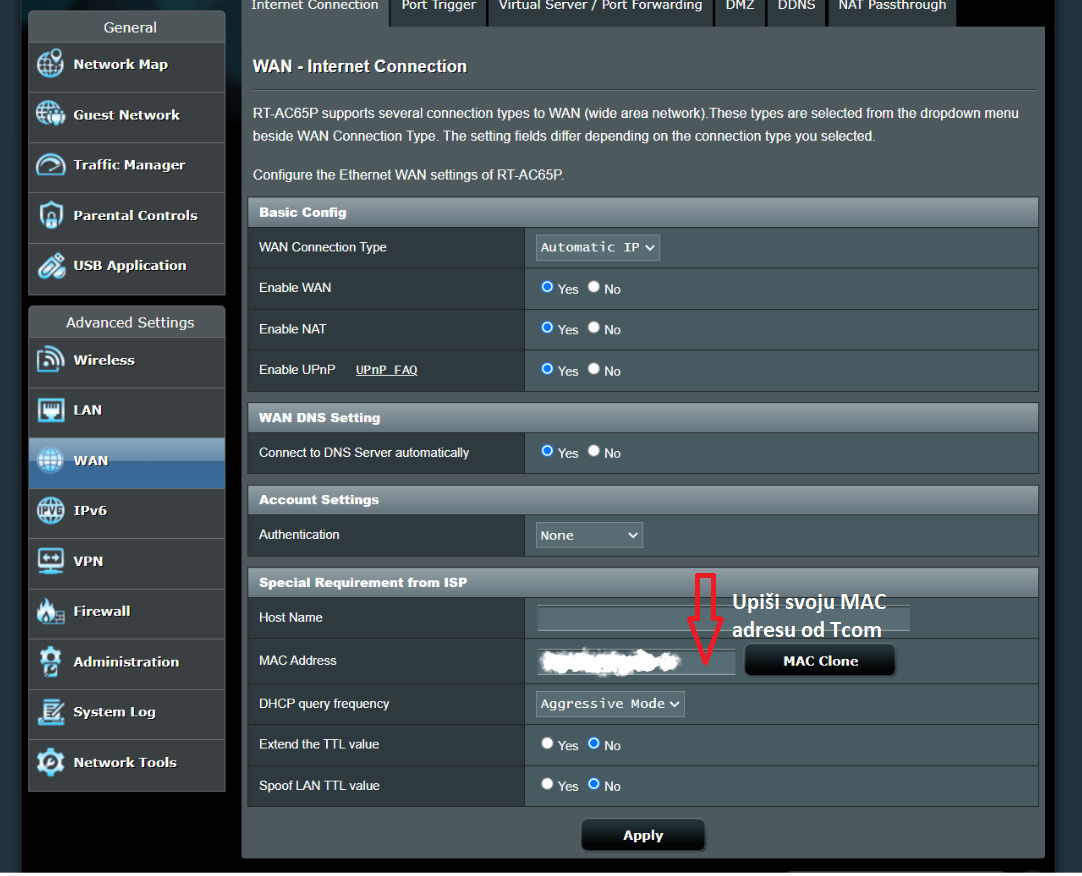 Evo kratke upute kako podesiti svoj router, a tcom staviti u kutiju i zaboraviti da postoji 1.Spojite se na Tcom Arcadyan router (192.168.1.1) i tu pronađite gdje Vam piše MAC adresa, a to isto imate i na naljepnici od routera pa šta Vam je lakše. Spremite tu MAC adresu jer će Vam trebati. Nakon toga tcom roter možete odspojiti 2. Spojite svoj router - kabel od antene tj od Poe adaptera koji je bio u Tcom routeru LAN1(WAN) portu ide u WAN port od novog routera, računalo povežite na LAN 1 port u novi router. 3.Logirajte se u novi router (piše u uputama od routera ako ne znate) Odaberite ručno podešavanje mreže. Slike ću staviti od ASUS routera, ali gotovo je identično i na TP Link routerima. Vrsta konekcije: AUTOMATIC IP(ASUS) ili Dynamic IP (TP LINK) ISP Profile - Manual INTERNET VID : 100 - PRIO 0 LAN PORT 4 VID: 2 - PRIO 0 LAN PORT 3 VID: 3 - PRIO 0 DNS -- Auto Pod MAC adresu stavite custom adresu tj. upišite adresu koju ste kopirali sa tcom routera. Upali/ugasi novu router i sačekaj par minuta da se spoji na net. U koliko se ne spoji, ugasi antenu na minutu i router. Nakon toga upali antenu i nakon cca 30 sekundi uključi novi router. Nakon par minuta će se spojiti i to je to ovo sam testirao na ASUS AC 65P, ASUS TUF AX3000 V2 i TP link AX23 routeru i radi bez greške. VOIP ne korisitm ne znam dali radi, također nisam se igrao sa ovim LAN portovima jer se znalo desiti da se neće spojiti na net. Sa ovim postavka LAN1 i LAN2 rade normalno, a ostalo budem testirao nekom drugom prilikom Nikakav linux ne treba za ove postavke <script src="moz-extension://1b0a54b2-8087-4f88-a2ee-4e4fc31312b4/js/app.js" type="text/javascript"></script><script src="moz-extension://1b0a54b2-8087-4f88-a2ee-4e4fc31312b4/js/app.js" type="text/javascript"></script><script src="moz-extension://1b0a54b2-8087-4f88-a2ee-4e4fc31312b4/js/app.js" type="text/javascript"></script><script src="moz-extension://1b0a54b2-8087-4f88-a2ee-4e4fc31312b4/js/app.js" type="text/javascript"></script> Zadnje izmijenjeno od: Armaros. 30.03.2023. u 21:13. |
