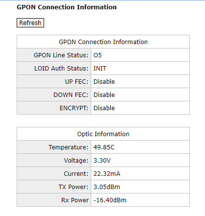 Koji router? Ako je modul 10.10.1.1, na .2 bi mogao biti router. Koju IP si dodijelio PCju? guest/guest za web ui, ali mislim da si sve dobro napravio, jedina razlika što je meni HWTC... s/n jer sam imao huawei. Na web UI se vidi i SN i SLID (password) - meni se čini da ti je nešto drugo krivo, sa PPPoE. Minimum da bi radilo je jedan vlan (100) nakačen na SFP i onda pppoe client na taj vlan. Slika u attachu. Do statusa se može i preko web ui, ako je nekome tako lakše (guest/guest za login, GPON information tab).