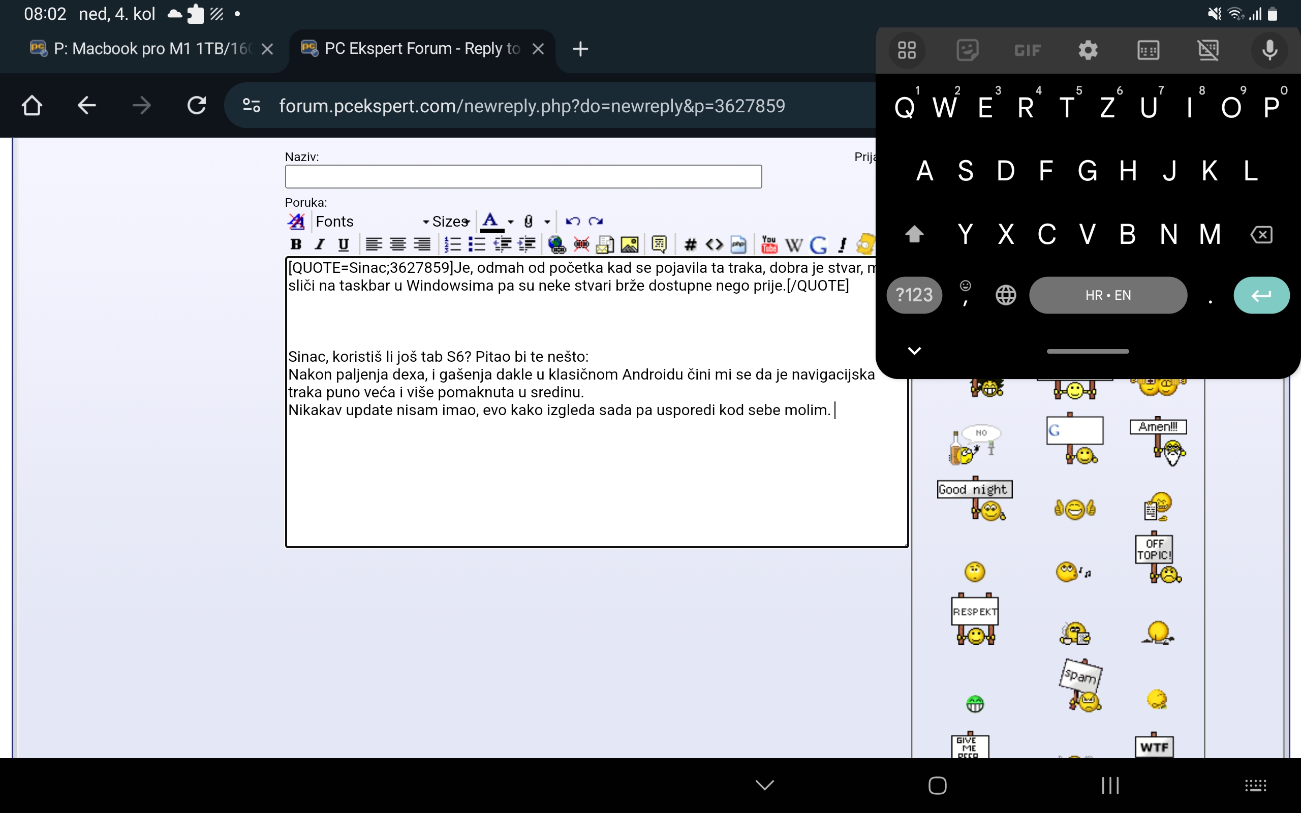 Sinac, koristiš li još tab S6? Pitao bi te nešto: Nakon paljenja dexa, i gašenja dakle u klasičnom Androidu čini mi se da je navigacijska traka puno veća i više pomaknuta u sredinu i ne vidim nikakav način da vratim na prvobitno stanje. Nikakav update nisam imao, evo kako izgleda sada pa usporedi kod sebe molim. |