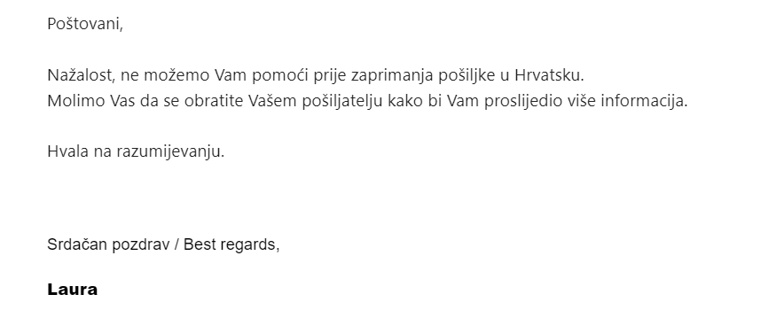 Meni nijednom nije uvažen prigovor kad god bi tracking status bio da je prikupljeno od "local delivery company". Defaultni odgovor je da odem u lokalni poštanski ured. Čim pošiljka dobije taj status ovi iz aliexpressa smatraju kao da ti se nalazi 100 metara dalje u poštanskom uredu i čeka samo tebe. Ako je to nešto što nosi HP, postoji djelomična nada utjehe da će ti za još jedno 30 dana ipak stići doma. Meni HP dostava s aliexpressa traje oko 2 mjeseca, a overseas dođe za 2-3 tjedna i to obično dan do dva kasnije kad pošiljka dobije status da je prikupljena "lokalno".