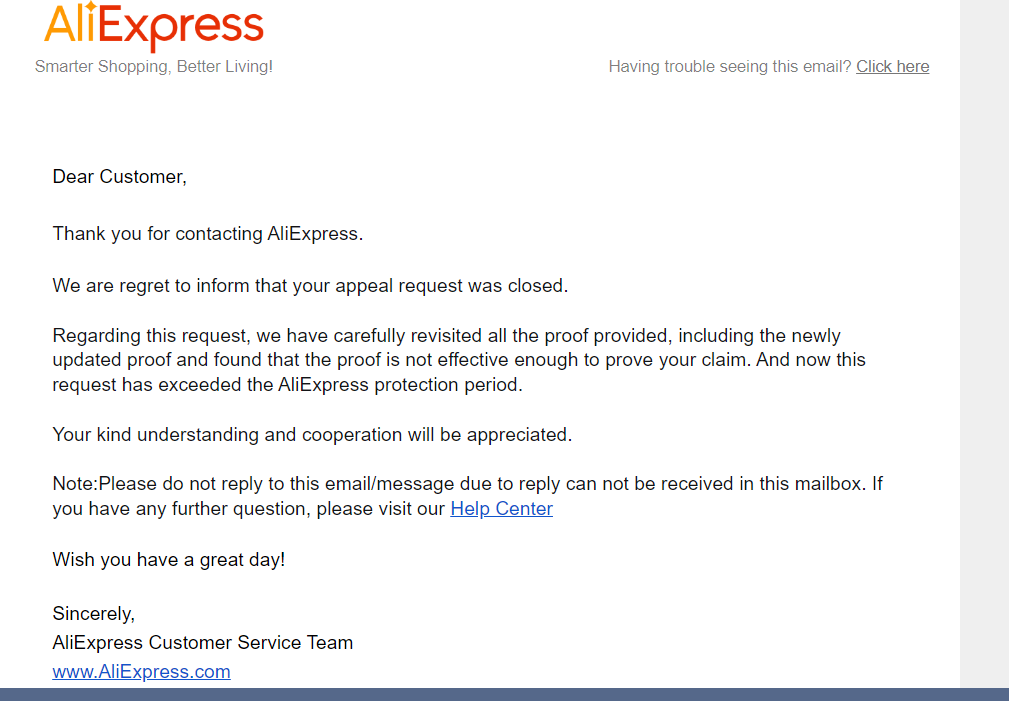 Dispute su odbili,digao sam appeal koji su odbili naravno iako sam opetovano pisao da krivo pise delivered kad na express one trackingu stoji 20.9. i uzalud,ti Kinezi su takvi debili,nema sanse vise da narucujem nesto vrijednije preko Aliexpressa,ocito da mi je posiljka zapela negdje i oni imaju opravdan razlog da odbiju jbt ... Eto cisto da znate ako ste narucili nesto vrijednije i pise vam delivered iako niste dobili i negdje je zapela posiljka,slobodno zaboravite novac i posiljku... |