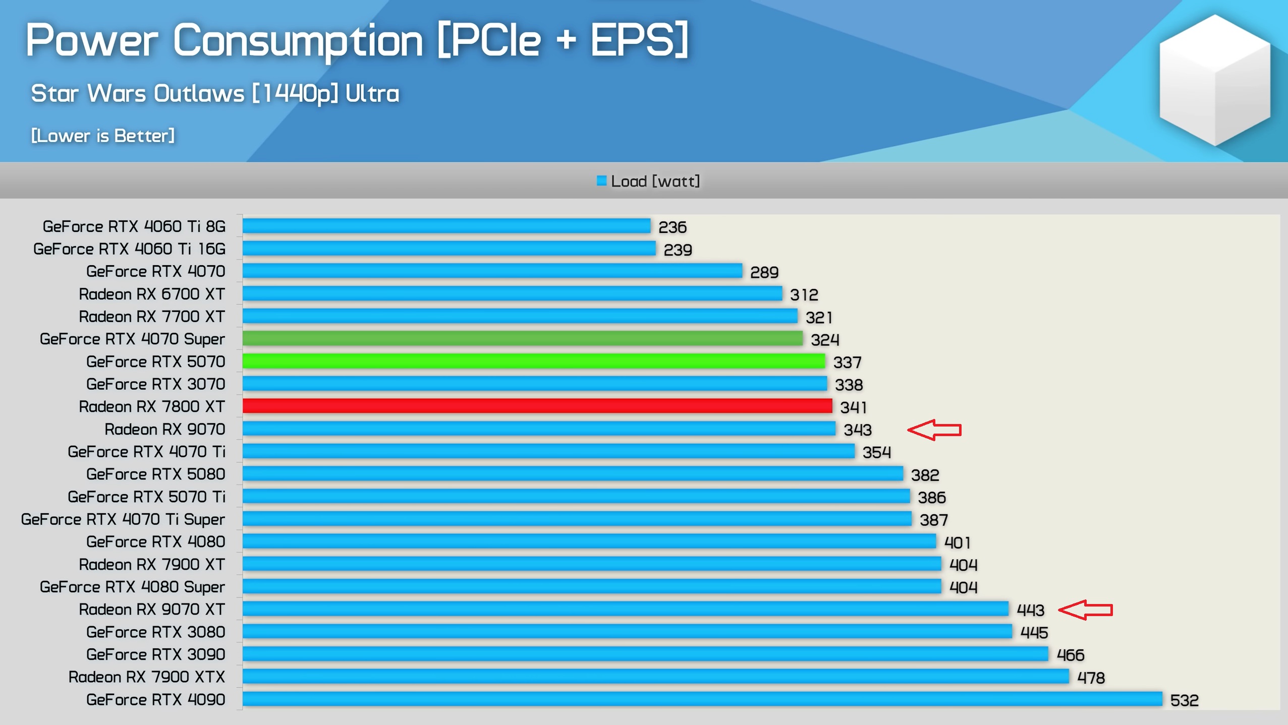 Kaj se potrošnje tiče, RTX 5070 u igrama troši kakvih 220W, dok s uključenim ray-tracingom ide na 250W. Na kraju ispada da HUB Steve ima ~100W veću potrošnju za sve kartice. Citiraj: