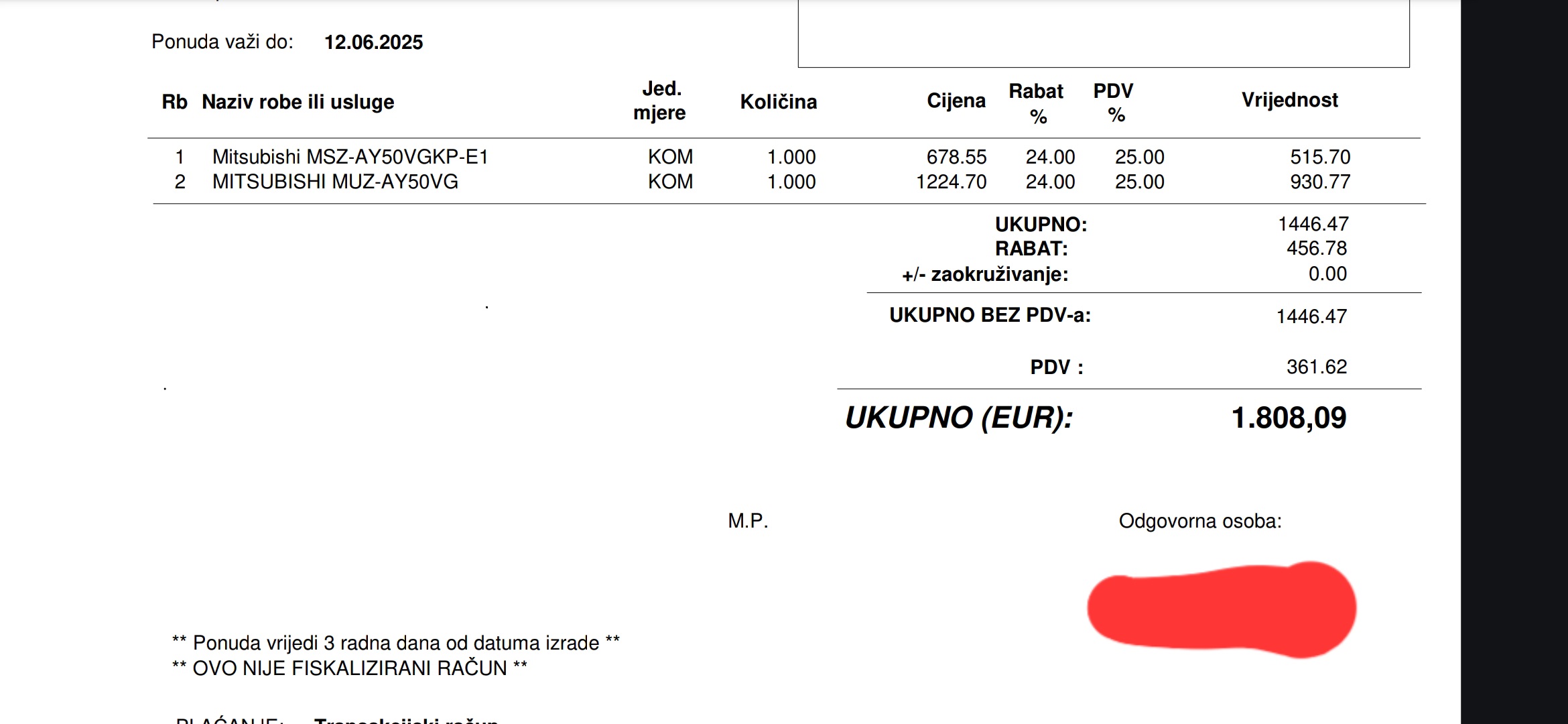 Veka Ing je veleprodaja od klimatizacija.hr Kod njih sam uzeo Mitsu FT35 za viksu od staraca, malu, 30ak kV. Tada je stara platila 1300 i nešto sitno EUR taj model. Trenutno je skoro 2k EUR pa si mislim da su se gospoda malo previše polakomila... Poslano sa mog SM-S928B koristeći Tapatalk |