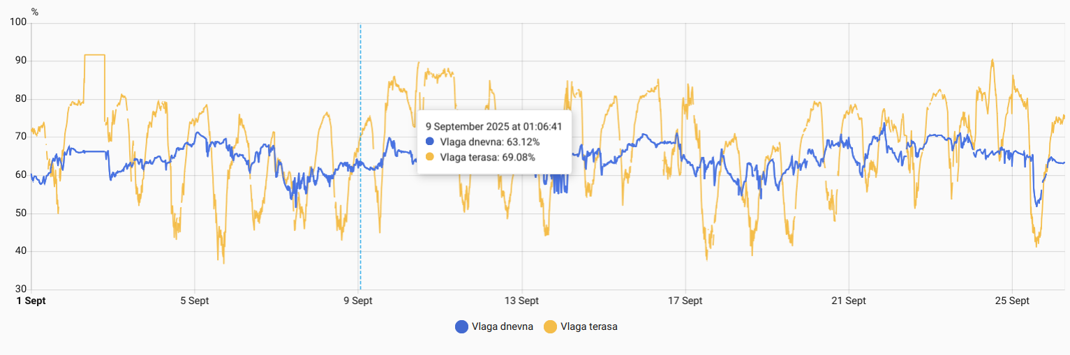 Slično je i kod mene. Isto gledam troteca izvaditi, očistiti i pripremiti za zimu. Namjena rekuperatora nije da skida vlagu, nije to odvlaživač. Za kasnije kroz zimu kad bude hladnije dosta me interesira. Namjena mu je da izmijeni zrak, izbaci ustajali (mjeri CO2) i vlažan (mjeri vlagu) van i ubaci svježi izvana, a da pritom se ne gubi previše na razlici temp. Ajmo reći zamjena za prozračivanje. Sada raskopavam struju u stanu koji je u renovaciji pa da odmah i struja se povuče na mjesta gdje bi došli rekuperatori. Preporučio električar da odmah stavim barem kutije pa poslije razmislim da li ću bušiti zid i to ugrađivati. Evo vlaga zadnjih mjesec dana... sunčana terasa vs dnevna uz uredno prozračivanje. |