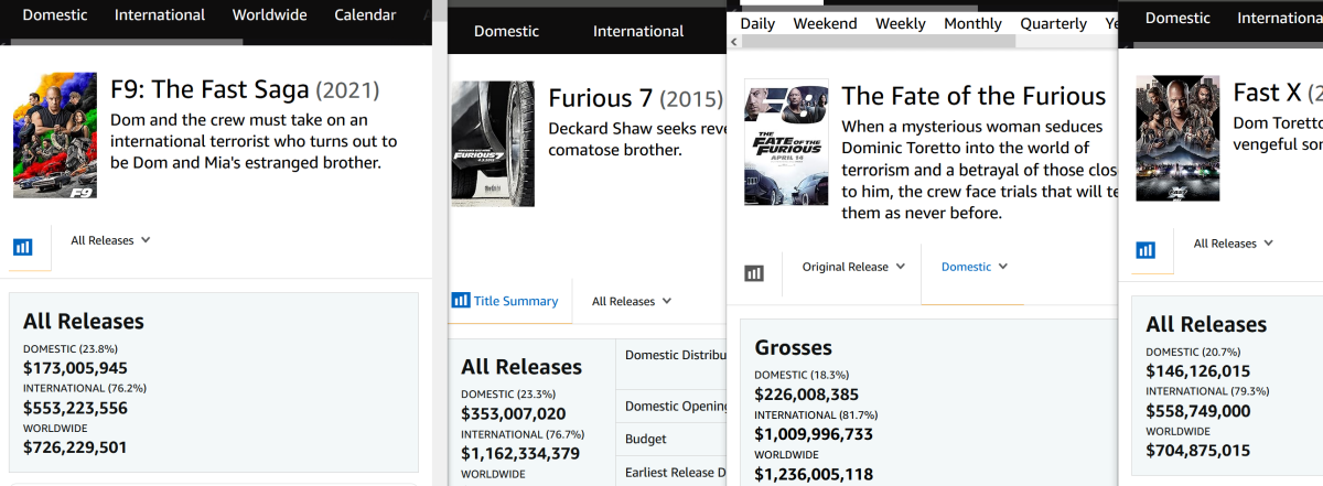 Ja mislim da ti treba oduzet pravo govora dok ne pogledas sve fulmove ![]() ![]() FnF 7 worldwide 1.5bill. Tom Cruse sa sadnjim svojim filmom uzeo tek pola. Na zalost ili na radoist, uz transformerse i animirane filmove, najprodavaniji IP. Dizel je genije.