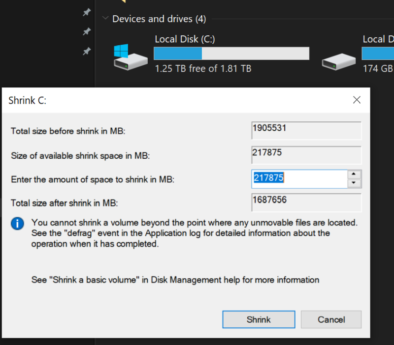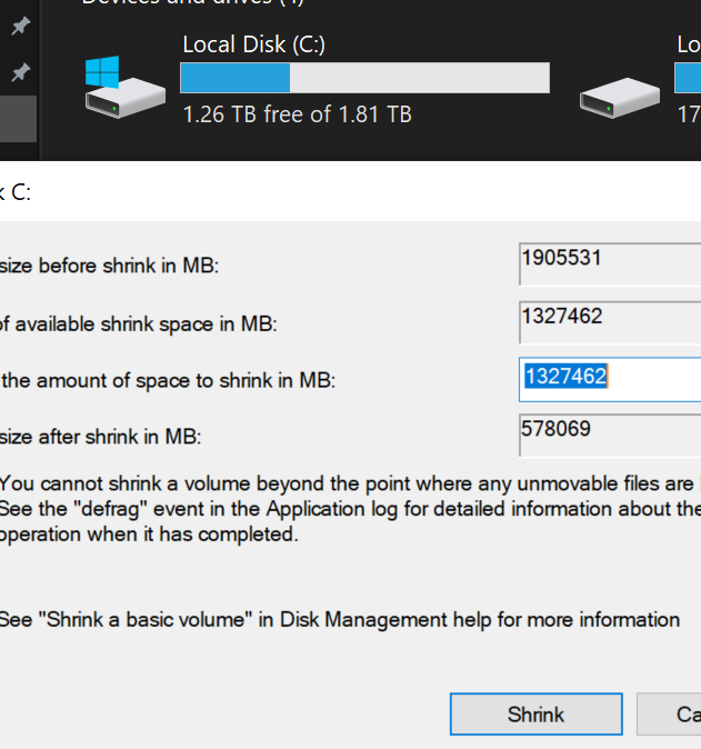 Ne treba mi vise cijeli disk za C:, 2TB NVME, i sada imam 1.3TB free prostora. Da ne dizem nanovo win10, kontam napraviti novu particiju. Ali standardni problem, od 1.3TB, nudi 217GB. Probao sam sve (gasenja hibernacije, paging file, restore point, disable kernel dumb) i chkdisk. Nista ne pomaze. Ima li nacina da ovo procepi ili mi ne gine dizanje nanovo win10 pa kreiranje particije prije instalacije?