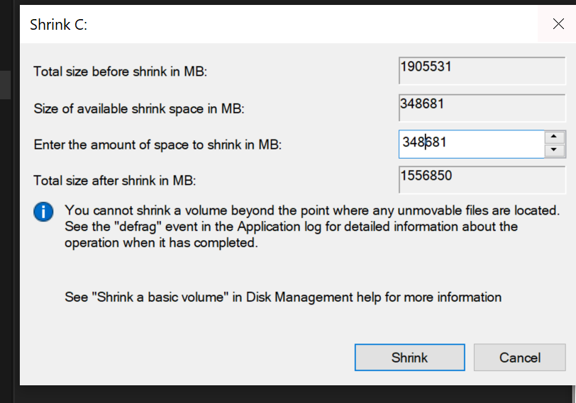 Windows shrink nije nikada bio neka sreća, ali je taj konzervativni pristup ne diranja sistemskih fajlova vjerojatno pridonio pouzdanosti postupka. Ono što biš treba odraditi je contig, ne chdsk. To bi ti trebalo dopustiti da napraviš više prostora, međutim ono što te vjerojatno blokira je MFT tablica. Gparted to riješi bez problema. Maknuti će fajlove gdje treba i napraviti mjesta. MEĐUTIM, gparted promijeni tip particije. I onda windows bootloader više ne vidi sistemsku particiju. Zadnji puta kada mi se to dogodilo morao sam ručno postaviti tip particije broj 7. Tako sam i zapamtio, lucky number seven.