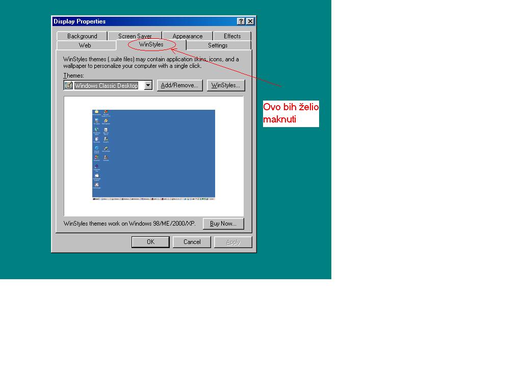 Jedan lijepi dan ja ubacim Bugov CD u CD-ROM i problemi počinju... Instaliran neki program zvan WinStyles ThemeManager 1.5. Naime instalirao sam taj program da ga malo isprobam, a sada sam ga odlučio ukloniti. Kad sam ga želio izbaciti iz svog kompjutora, nikako nisam mogao pod Add/Remove Programs (opcije Uninstall nema za cijeli program). Izbrisao sam neke dijelove programa, dok mi za neke piše da ne može pronaći file INSTAL.LOG. Program se uklopio u Propertis za desktop i ostale sitnice i napravio dodatnu opciju zvanu WinStyles koju ne znam kako maknuti (ima i slike kako to izgleda). Može li mi netko pomoći ukloniti taj program? ![]()  |