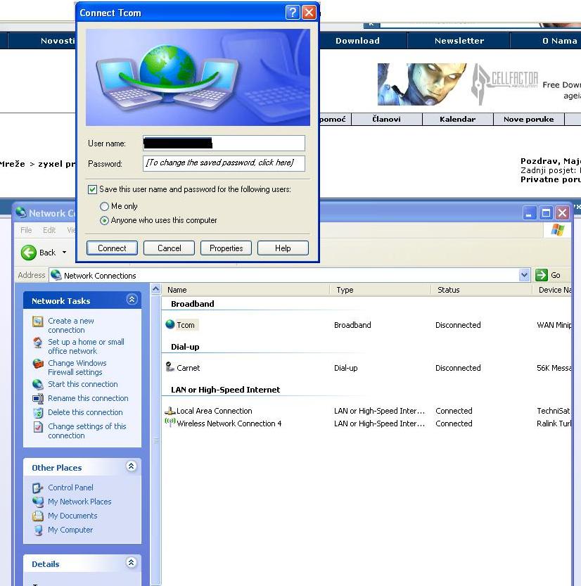 . ako koristis nailed-up ili connect on demand onda moras imat upisan user name i pass a ako koristis PPPoE (satro dial-up) onda upises user name i pass u kucicu prilikom konektanja (vidi sliku) ![]() |