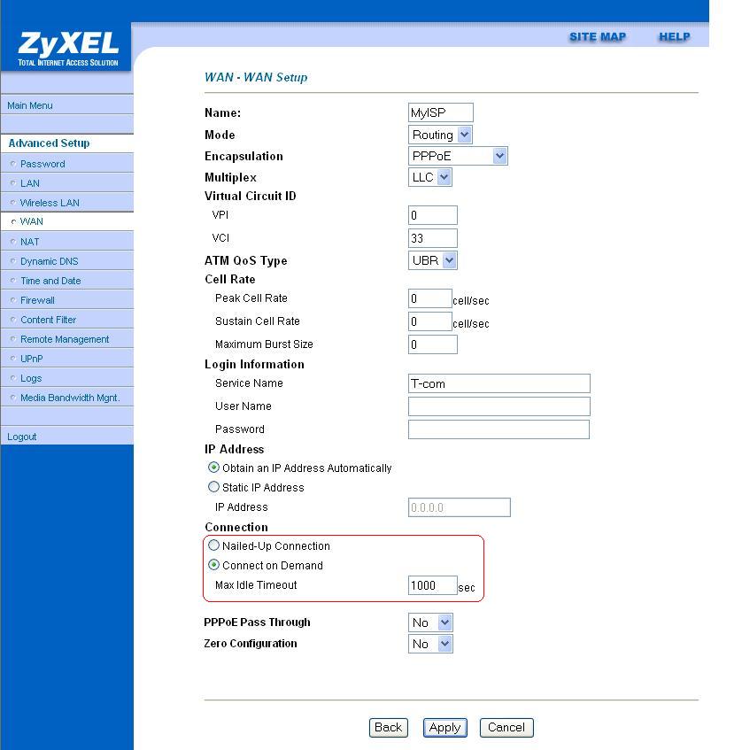 cuj meni je postavljeno na 1000 sekundi. nije bitno kolko stavis sam da ti nije recimo manje od 2 minute jer recimo citas nekaj na forumu pa ti on prekine vezu pa moras cekat da ju ponovo uspostavi. sto se tice pucanja veze izmedu centrale i modema (rutera) ne bi se smjelo dogadat, medutim ak je velika udaljenost moze tu i tam puknut veza ili zbog losih instalacija. kao sto rekoh ruter je ok sam kod mene je problem s wireless vezom izmedu rutera i kompa, a ne modema i centrale. sori, user name i pass sam izbriso na slici, izgleda ko da nije nis napisano . ako koristis nailed-up ili connect on demand onda moras imat upisan user name i pass a ako koristis PPPoE (satro dial-up) onda upises user name i pass u kucicu prilikom konektanja (vidi sliku)