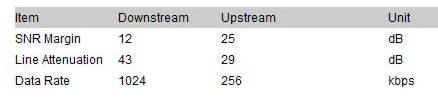 (downstream) (upstream) SNR Margin 39.6 30.0 dB Line Attenuation 9.8 0.0 dB Errored Seconds 0 1 Loss of Signal 2 2 Loss of Frame 0 0 CRC Errors 0 0 Data Rate 1024 256 kbps Jel valja ovo? |