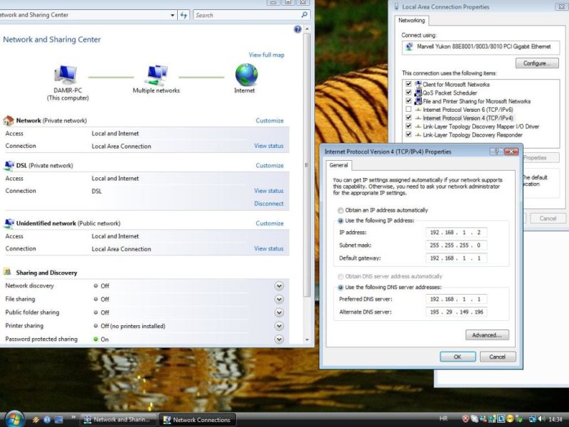 U postavkama mrežne sključi TCP/IP v6, u TCP/IP v4 manualno postavi: IP = 192.168.1.2 Subnet = 255.255.255.0 Gateway = 192.168.1.1 DNS1 = 192.168.1.1 DNS2 = 195.29.149.196 DNS3 = 195.29.149.197 (da možeš ih još dodati preko Advanced + Add) |