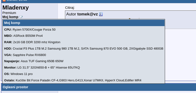 Ja to uopće ne protuslovim, nisam nikad ni rekao da linux ne radi bolje od windowsa na slabijem hardveru ili bilo kojem hardveru (edit, rekao sam da ima slabije gaming performanse 5%-15% što pokazuju testovi). Na poslovnom laptopu nisam primijetio nikakav lag, nešto se sporije pali i to je to, ali pričamo o dvadesetak sekundi razlike. Ono što sam rekao da 1. sam zadovoljan sa windowsima 11 i da su trenutno bolji za moje potrebe na gaming kompu od nekog drugog OS-a. 2. da me nije briga što koriste moje podatke za vlastitu korist, sve dok ja imam veću korist od njih nego oni od mene. Zadnje izmijenjeno od: Mladenxy. Jučer u 20:13. |