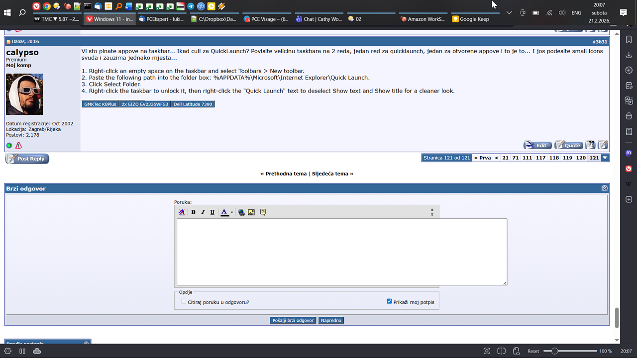 Vi sto pinate appove na taskbar... Ikad culi za QuickLaunch? Povisite velicinu taskbara na 2 reda, jedan red za quicklaunch, jedan za otvorene appove i to je to... I jos podesite small icons svuda i zauzima jednako mjesta... 1. Right-click an empty space on the taskbar and select Toolbars > New toolbar. 2. Paste the following path into the folder box: %APPDATA%\Microsoft\Internet Explorer\Quick Launch. 3. Click Select Folder. 4. Right-click the taskbar to unlock it, then right-click the "Quick Launch" text to deselect Show text and Show title for a cleaner look. ![]()