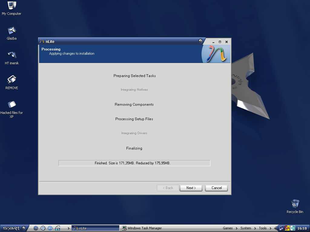 dobar dobarrr:clap: ja uspio smanjit na 197Mb iz prvog pokušaja sa već prije integriranim SP2 al mi se neda reinstalirat, tek neki dan sam formatirao hard ![]() frend će mi bit pokusni kunić, njega nešto zajebavaju windowsi pa ću mi ih reinstalirat sa nLite verzijom ![]() |