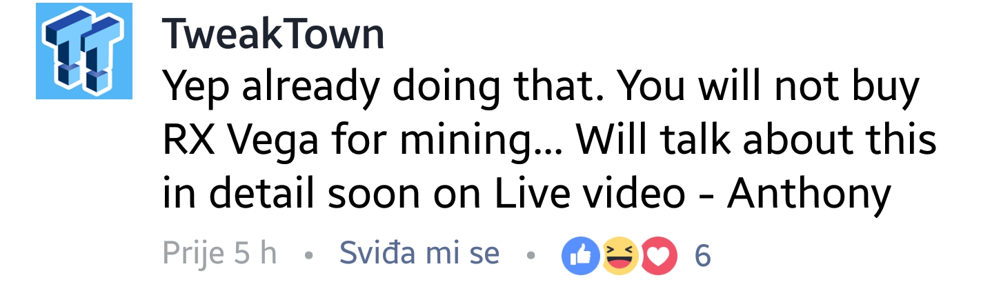 E sad da nema majnanja, ovo bi bilo jako zanimljiv kraj ljeta/početak jeseni, kao onda kad smo imali R9 vs GTX970/980. tad je kartica bilo ko dreka i baš je bio lijepi hype čak i lani GTX 1060 vs RX480...Ovo je sad nekako meh... Prvo, Vega kasni barem godinu dana. Drugo, dostupnost joj je ovog momenta vjerojatno nikakva. Treće, kad se nereferentne kartice pojave, pobrati će ih mineri ili će cijene biti astronomske pa će se kupovati GTX1080 koji sada ima ko pljeve i za OK pare. Inače, sve najbolje želim Vega seriji. Ko zna, možda budu po 2500 soma za kojih godinu dana u CaseKingu, kao onomad Fury ![]() @mob |