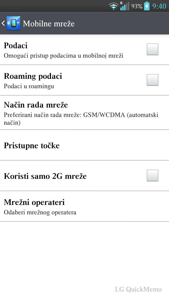 Prve dvije točke sa svoje slike moraš također uključiti (Mobilni podaci i podaci u roamingu). Ako se neće spojiti, probaj prebaciti na GSM samo (pod način rada mreže). Pripazi kad prolaziš blizu druge države, jer ti nemaš odvojeno opciju za nacionalni roaming i internacionalni roaming (kako to neki androidi imaju).