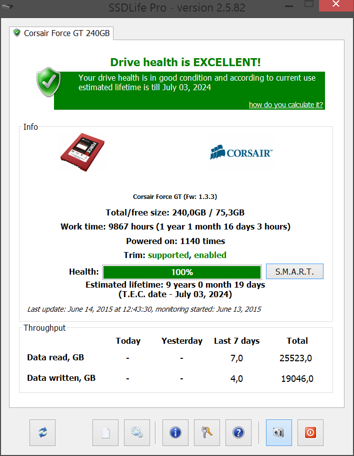 OK, evo screenshot SSDLife-a. Mogu mirno spavati. Nije loše za disk kupljen 2011 i koji radi skoro pa 24/7. Podatak o work vremenu ne štima (?) Dali je moguće da je to zbog apdejta firmvera ? Smeta me da nemam info o količini preostalih R/W podataka. |