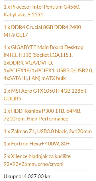 [QUOTE=Tvrdi;3139200]Da, zato sam mu napomenuo da mu je bolji izbor ako mu neće biti samo za igre... Pošto se na računalo najviše igram (LOL, PUBG, CIV5, a htio bi probati i GTA V), a navodno je za online igre potrebno što više jezgri probao sam staviti i3 8100. Ako ti veliš da je za igre dovoljan i G4560 onda bi uzeo nešto ovakvo. Može li nekvo drugo kučište za tu lovu jer mi ovo ne izgleda previše lijepo. |