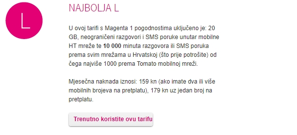 ![]() I nije baš 'klasična' najbolja L, jer na klasičnoj ako nisi u magenti nemaš 20gb nego 10gb, nemaš ovaj 1gb extra kao da je bitno jel 20 ili 21 al eto ), i nemaš sportklubove i filmske programe na maxtv to go-u, dok u magenti sve to imaš na mobu najnormalnije.