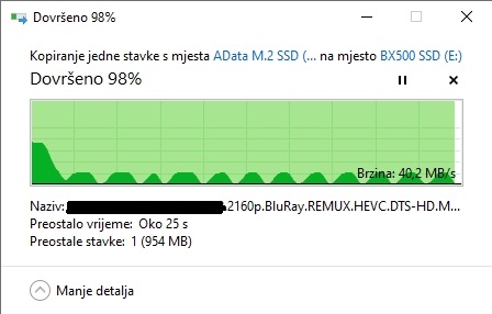 Crucial BX500 2TB Čitanje i pisanje file-a od 4,36GB dosta brzo, više od 500mb/s. Čitanje file-a od 60GB, 2min15sec, isto ok, oko 455mb/s. Pisanje file-a od 60GB, oko 9min, brzina svako malo pada na oko 40mb/s, prosjek ispada 113,77mb/s, scan u privitku. Kopirano sa M.2 NVMe SSDa. Po meni jako loše, čak i za ssd za pohranu, i ovdje su staviti QLC. Kupio sam ovaj ssd prije par mjeseci, za 1200kn, kad nisam znao da je Crucial u određene ssd-ove počeo stavljati QLC umjesto TLC memorije. Nije neka katastrofa jer je SSD za pohranu, ali da sam znao ne bih ga kupovao, bez obzira što je bio povoljan, znao sam da je sporiji ali ovoliko?? |