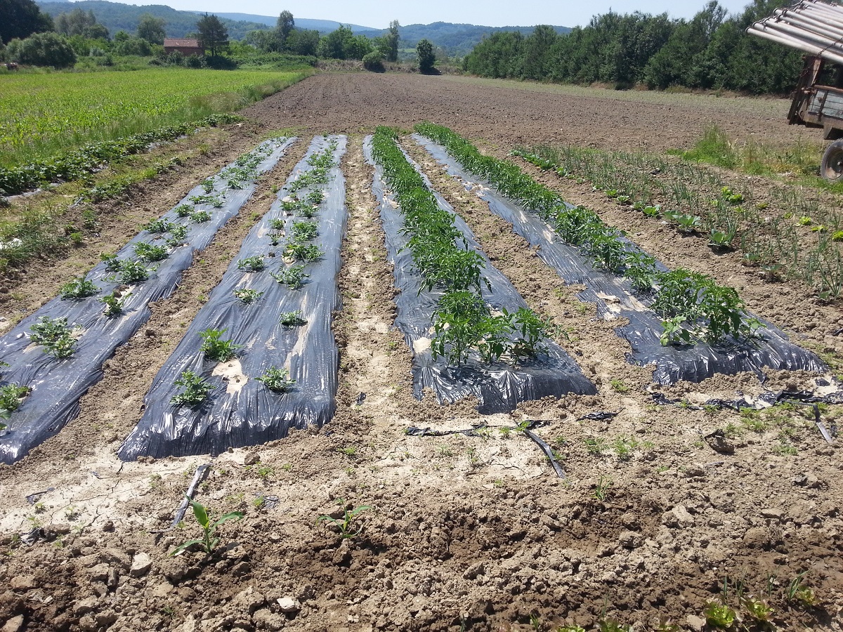 Nagib je popriličan, cisterna je iznad prvih nasada oko 1m cca, pa sad računaj hipotenuzu cijevi. Znači otprilike bilo bi slično kao i kod tebe. Jedno crijevo za svaku gredicu ili kako to ide? Folija na zemlju i rez tamo gdje je biljka ili?