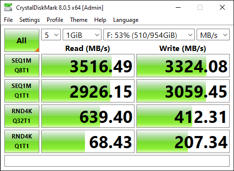 Stigao Adata. Nešto je sporiji u pisanju od Samsunga, ali s obzirom na razliku u cijeni, oprošteno mu je. Ono što treba zaobići je Adata Migration Tool. Samsungov radi savršeno, ali naravno da ne radi s drugim diskovima osim svojim. Ovaj kreten napravi klon 500 GB diska na način da napravi particije kakve jesu i prekopira disk, a razliku u veličini ostavi kao unallocated… Free AOMEI je riješio stvar (Windows Disk Manager ne želi iz nekog razloga). Uglavnom, bilo kakav drugi alat koristite za to…samo ne Adata Evo i testova (500 GB je Samsung 970 EVO, 1TB je Adata) ![]()