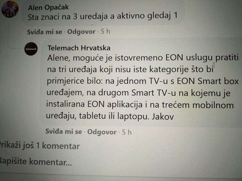 Evo dobio sam odgovor i na mail ''Poštovani gospodine , hvala Vam što ste kontaktirali Telemach. Provjerom Vaših korisničkih podataka je vidljivo kako su kolege s naše službene Facebook stranice već zaprimili prijavu poteškoće i proslijedili istu nadležnom odjelu napredne tehničke podrške. Poteškoća će biti otklonjena čim prije moguće te ćemo Vas po otklanjanju povratno kontaktirati, ljubazno molimo za malo strpljenja do tada. Informacija koja Vam je pružena je točna, istovremeno možete gledati na 3 registrirana uređaja: