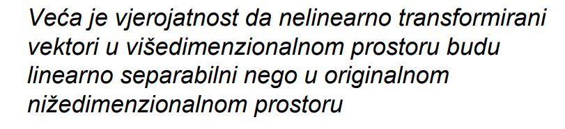 uzmi si to na nekom jednostavno primjeru. Googlaj XOR u 2D ravnini i pomicanje u viši prostor (3D), sićam se tog primjera. Recimo da imaš 4 točke u 2D ravnini: A 0,0 B 0,1 C 1,0 D 1,1 I sad kad ih nacrtaš u 2D-u (X,Y osi) , vidiš kako se tipa BC i AD križaju, odnosno, nema linearne crte koja ih razdvaja (linearna separacija). E sad, imaš SVM funkcije koje kao rješavaju ovaj nelinearan problem bez da explicitno prebacuješ sve u 3D model, jer to troši dosta CPU-a. Izvrši se matematička funkcija (x,y, x*y) i onda se napravi linearna separacija. A 0,0,0 B 0,1,0 C 1,0,0 D 1,1,1 I sad možeš povući linearnu crtu ispod BC i AD, čime si napravija separaciju. Ne znam koliko sam ti objasnija, ali eto ![]()