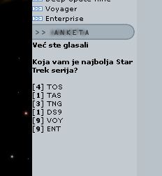 TNG Iako sam dvojio između TNG i DS9. Ali moram priznat da mi je i Enterprise drag, a Voyager se, ako ništa, drži kanona, iako ima i tu nebuloza. TOS nisam dosta toga vidio, kapetan je faca, Spock je lola, Scotty je jebač, ali ipak nedovoljno za moj glas. |