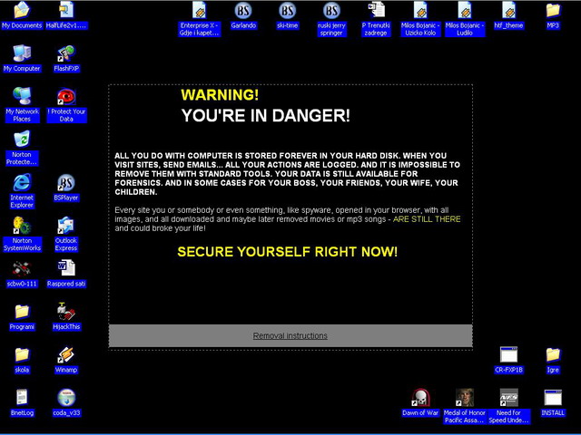 Probo sam i to samo kaj nije uspjelo. No rijesio sam problem. Ta me "reklama" vodi na stranicu od nekog anti-spyware programa (zamisli) i poslo sam mail njihovom tehnical supportu i decki su u roku 2h odgovorili. Isprike bla bla bla... i dali mi 2 nacina da se tog rijesim. Ako ce neko imat slicnih problema nek vidi ovo: Ovo je neki programcic lagani (oko 10KB) pa ga sam pokrenete http://www.smart-security.info/removal.html A ovo je nacin bez ikakve pomoci sa strane Right click at the very top of the screen it should appear as a standard options menu. - Select Properties - Desktop tab. - Click "Customize Desktop" button at the bottom. - Select "Web" Tab. - Uncheck "Security" checkbox. i hvala za trud Bubba |